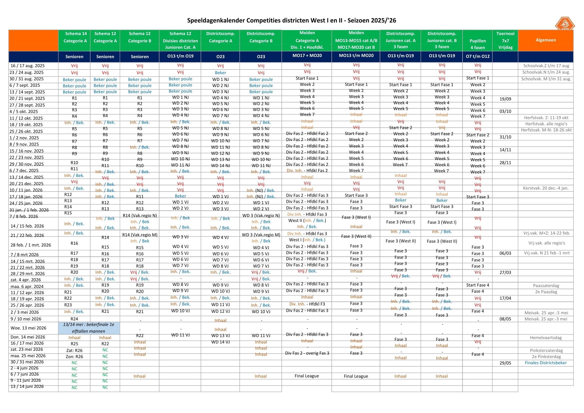 Speeldagen kalender seizoen 2025/2026
